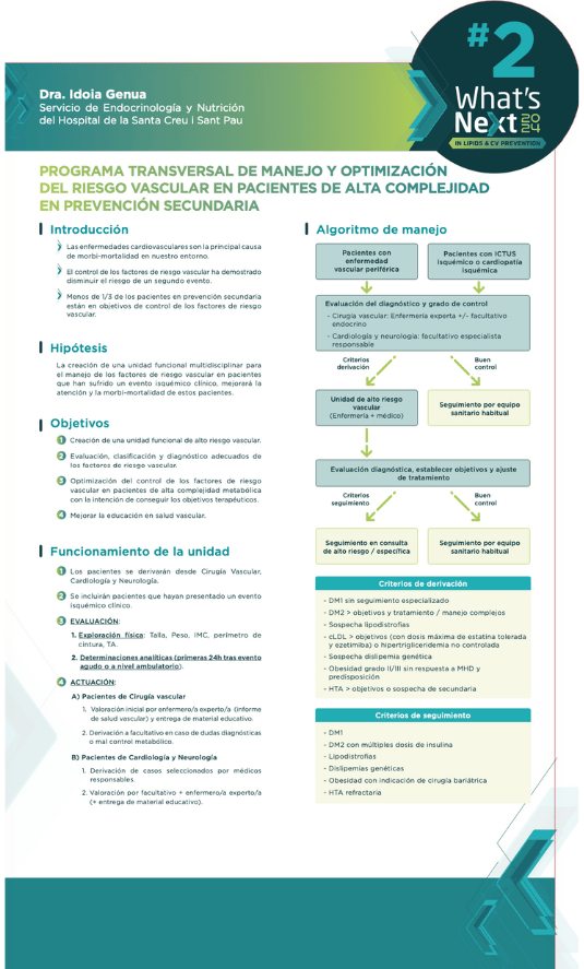 La Dra. Idoia Genua nos presenta en su póster un programa innovador lanzado en el Hospital de Sant Pau para mejorar el manejo del riesgo vascular en pacientes con complicaciones en la prevención secundaria. Este programa multidisciplinario atiende a pacientes con eventos isquémicos derivados de diferentes especialidades médicas. El proceso incluye evaluación inicial por enfermería y especialistas, diagnóstico completo de factores de riesgo y establecimiento de objetivos de tratamiento individualizados.