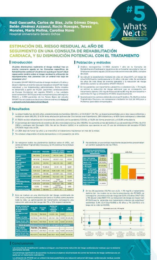 El estudio presentado por el Dr. Raúl Gascueña evaluó cuánto se reducía realmente el riesgo cardiovascular después de un año de consulta específica en pacientes con síndrome coronario agudo, utilizando el modelo SMART-REACH. Este modelo calcula el riesgo cardiovascular a 10 años y de por vida, permitiendo ajustes en el tratamiento para reducir el riesgo. Se analizaron retrospectivamente 262 pacientes de alto riesgo, observando una reducción del 5-6% en el riesgo a 10 años. Sin embargo, se identificó la necesidad de mejorar el control del colesterol c-LDL.